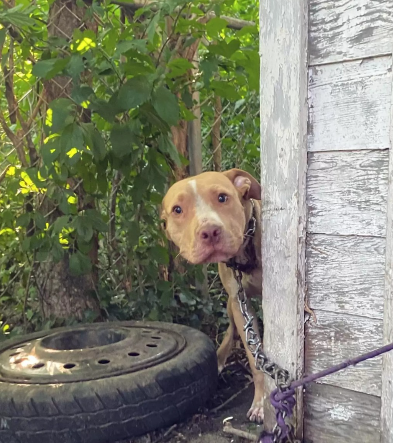 When a man in Detroit returned home one quiet afternoon, he never expected to stumble upon something that would change the course of a dog’s life. Yet there, in his neighbor’s backyard, he found a frightened dog chained tightly and left behind as if he didn’t matter. The sight unsettled him deeply. The dog looked abandoned, confused, and completely alone. Unsure what to do but determined to help, the man started making urgent phone calls, hoping someone—anyone—would answer. Thankfully, one of those calls reached Rebel Dogs Detroit, a rescue group known for stepping in when others can’t. Without hesitation, they sent a volunteer named Tiffany Perkins to the scene.