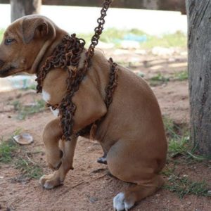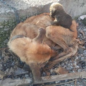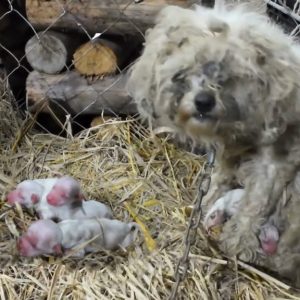 Chained, the mother dog holds her newborn puppies and cries when there is no milk to feed them